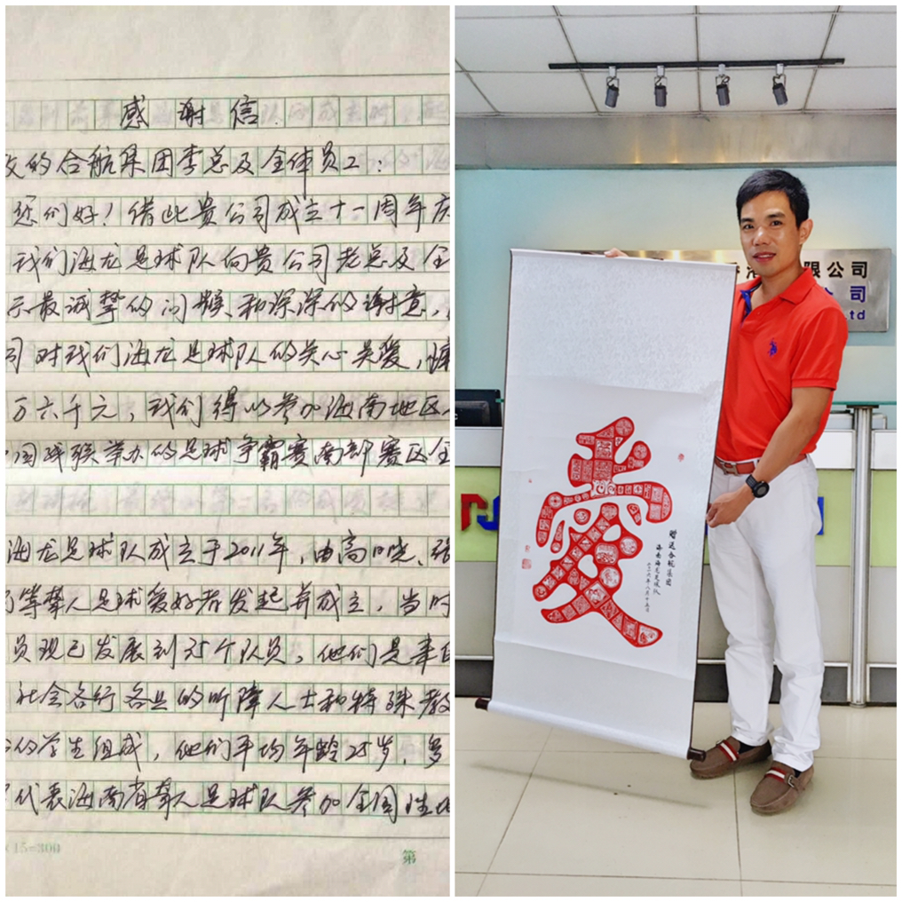 合航集團愛心基金會自成立以來,一直秉持著關(guān)愛員工回饋社會的理念,為幫助這群可愛的孩子筑夢,合航集團于2015年十周年慶典上向海南省海龍足球隊捐贈人民幣五萬元整,并于2016年開始正式撥款資助球隊比賽。海龍足球隊為感謝合航集團的關(guān)愛,特意為我司李董寄來了親筆感謝信及紀念品,讓愛散播在每個角落是我們共同努力的目標。